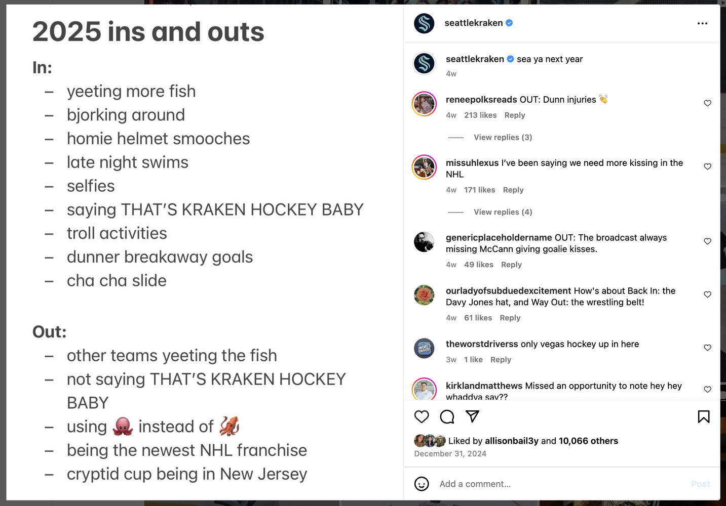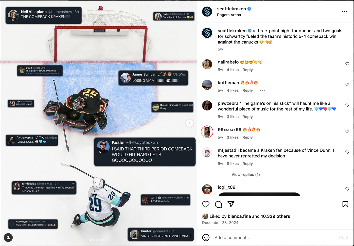The Kraken use their social media channels to keep fans informed and entertained, whether it's through in-game highlights, behind-the-scenes footage, or creative memes. Their ability to quickly adapt to trending moments—both within hockey and pop culture—keeps their content fresh and shareable. This dynamic approach boosts engagement and fosters a sense of excitement around the team.